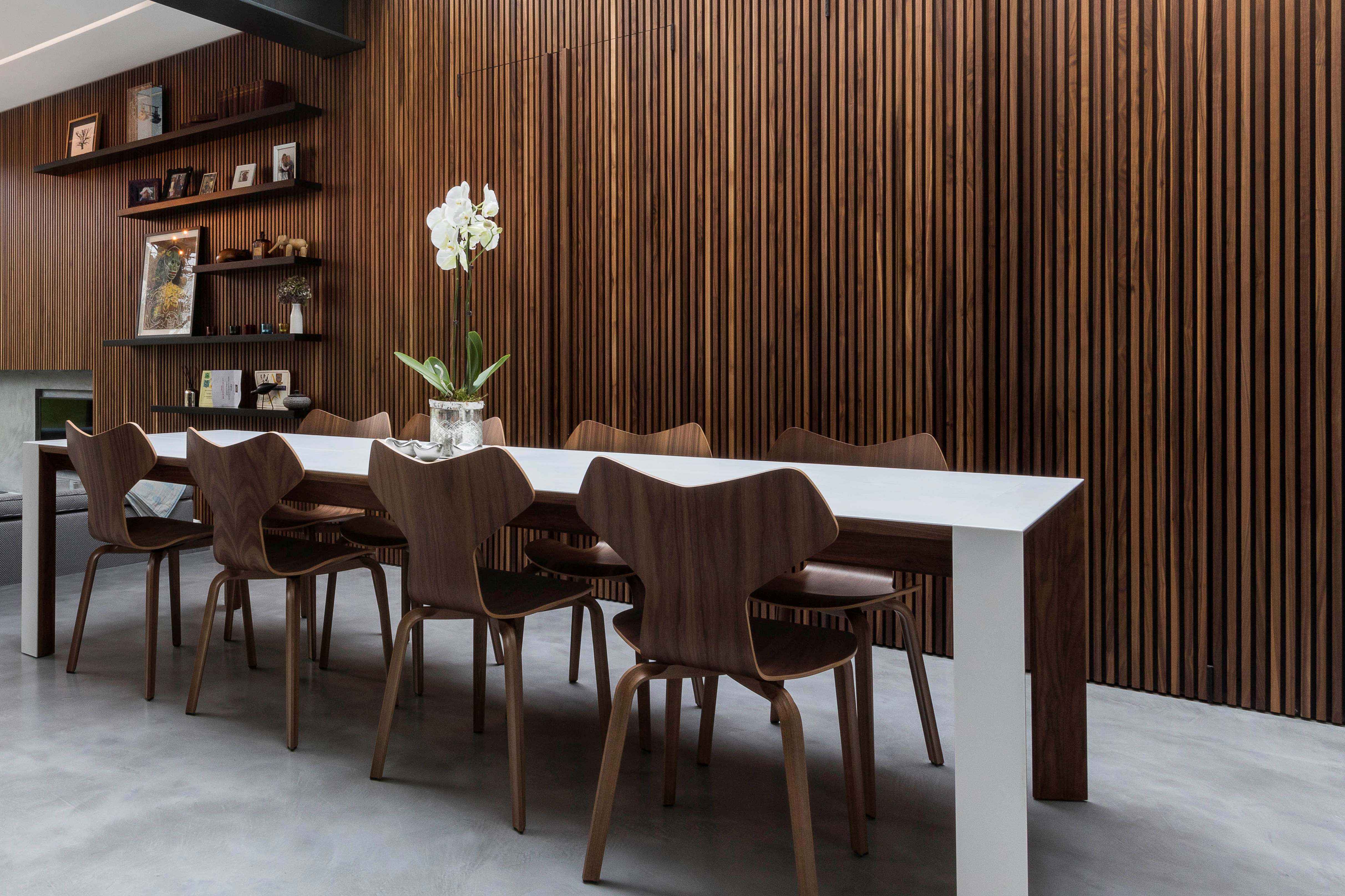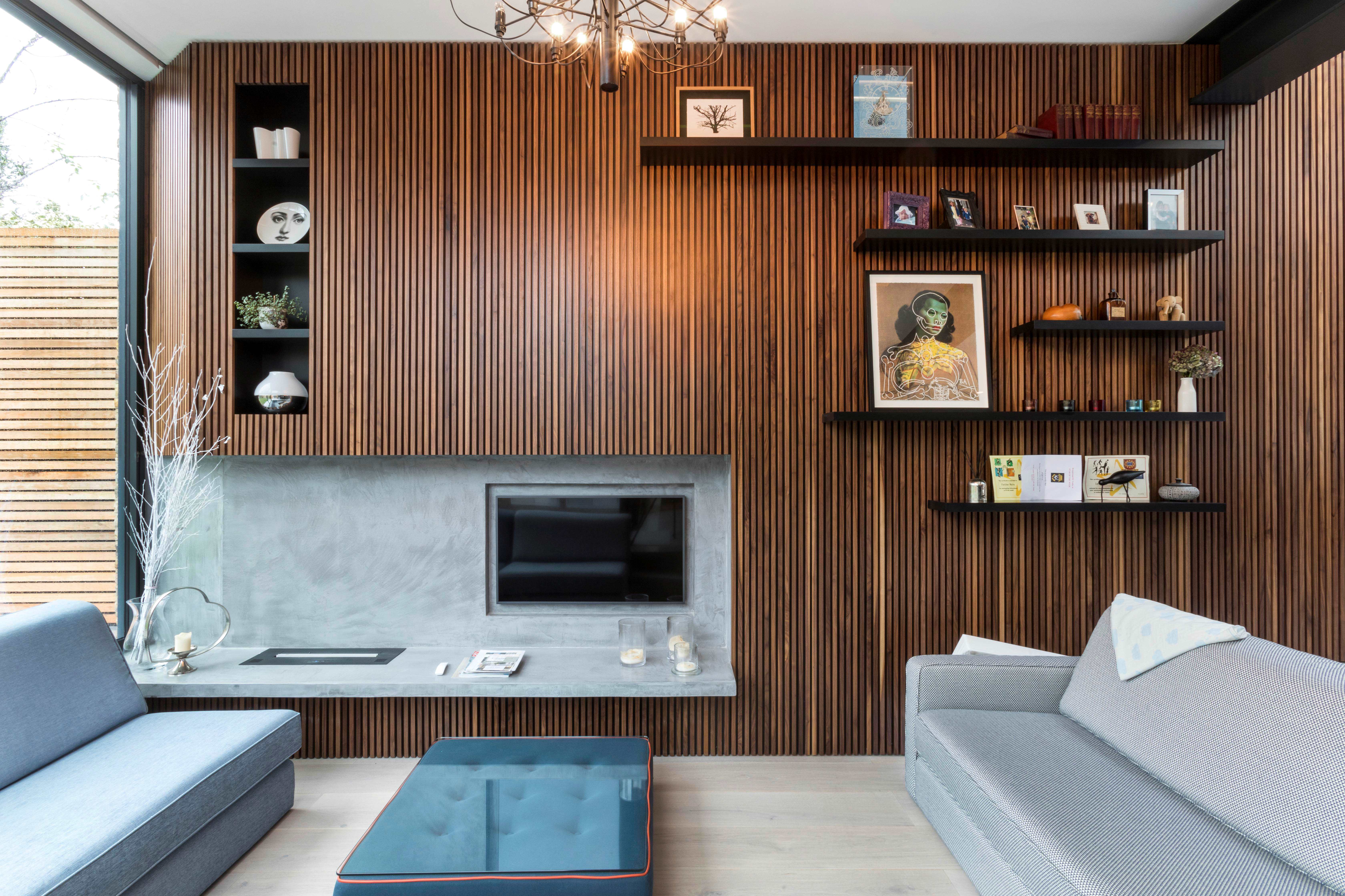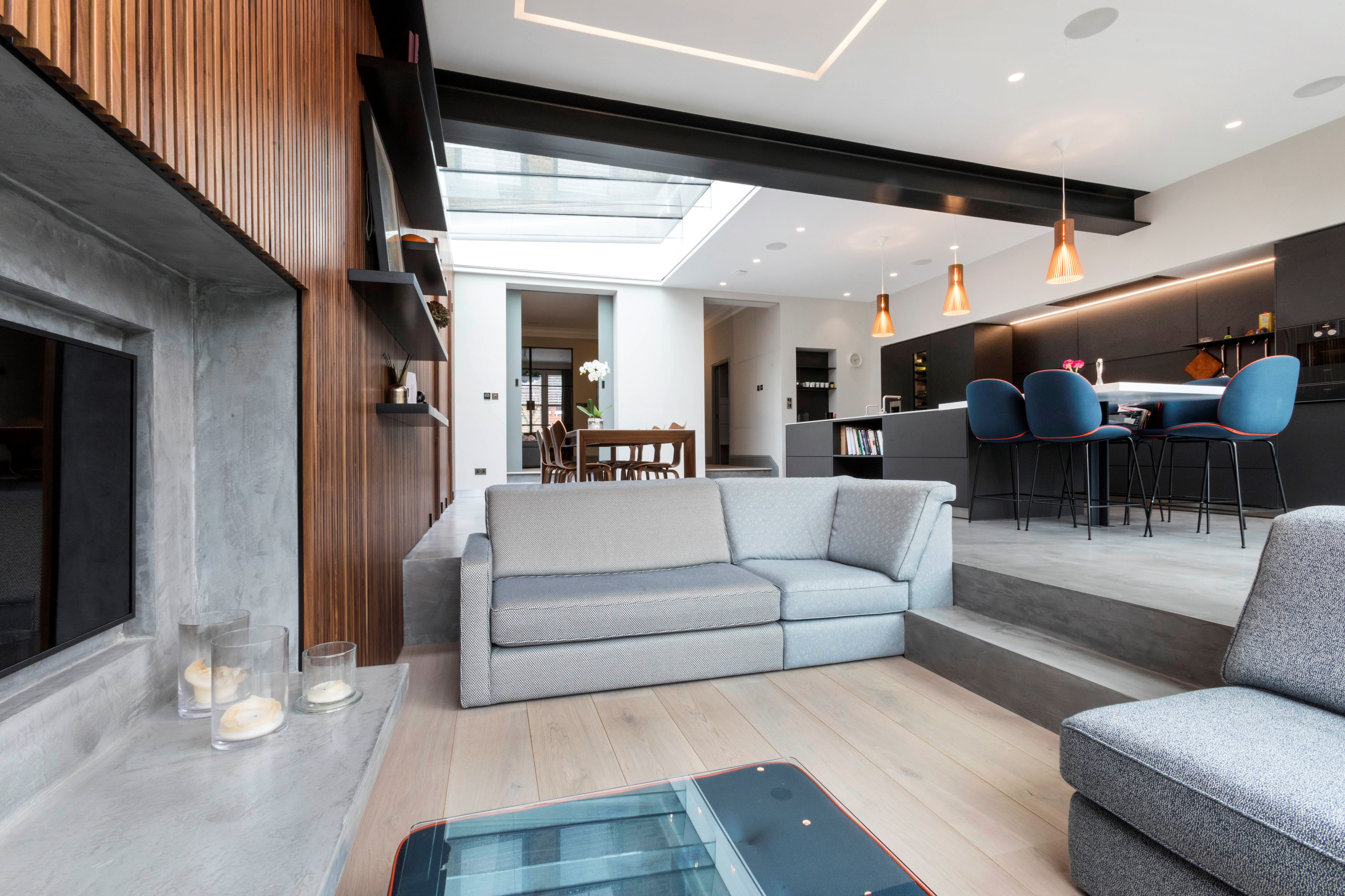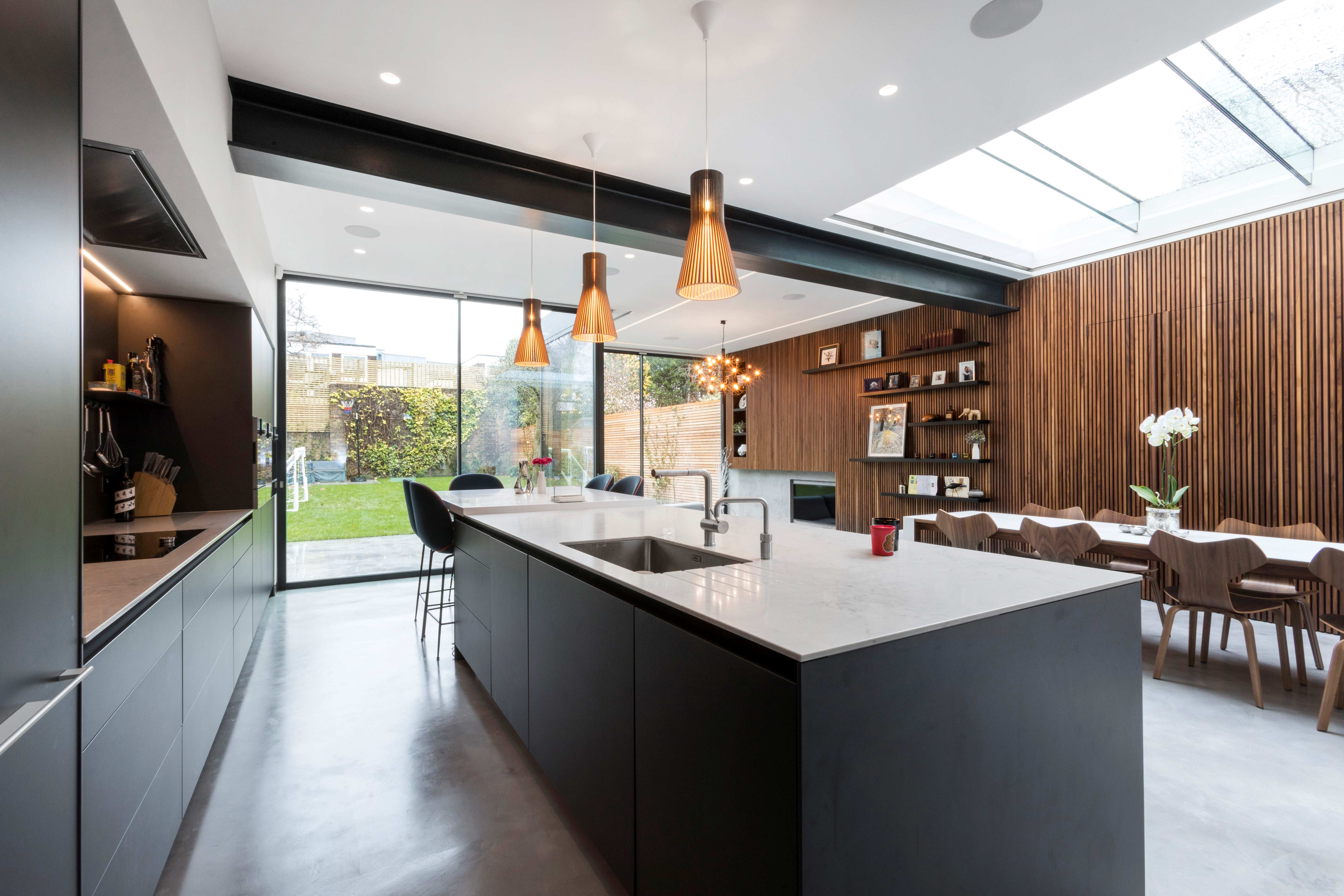 The open-plan kitchen, living and dining space features a full-height slatted timber wall, which discreetly conceals storage and internal doors while bringing depth and rhythm to the space. A large rooflight over the dining table draws natural light deep into the plan.