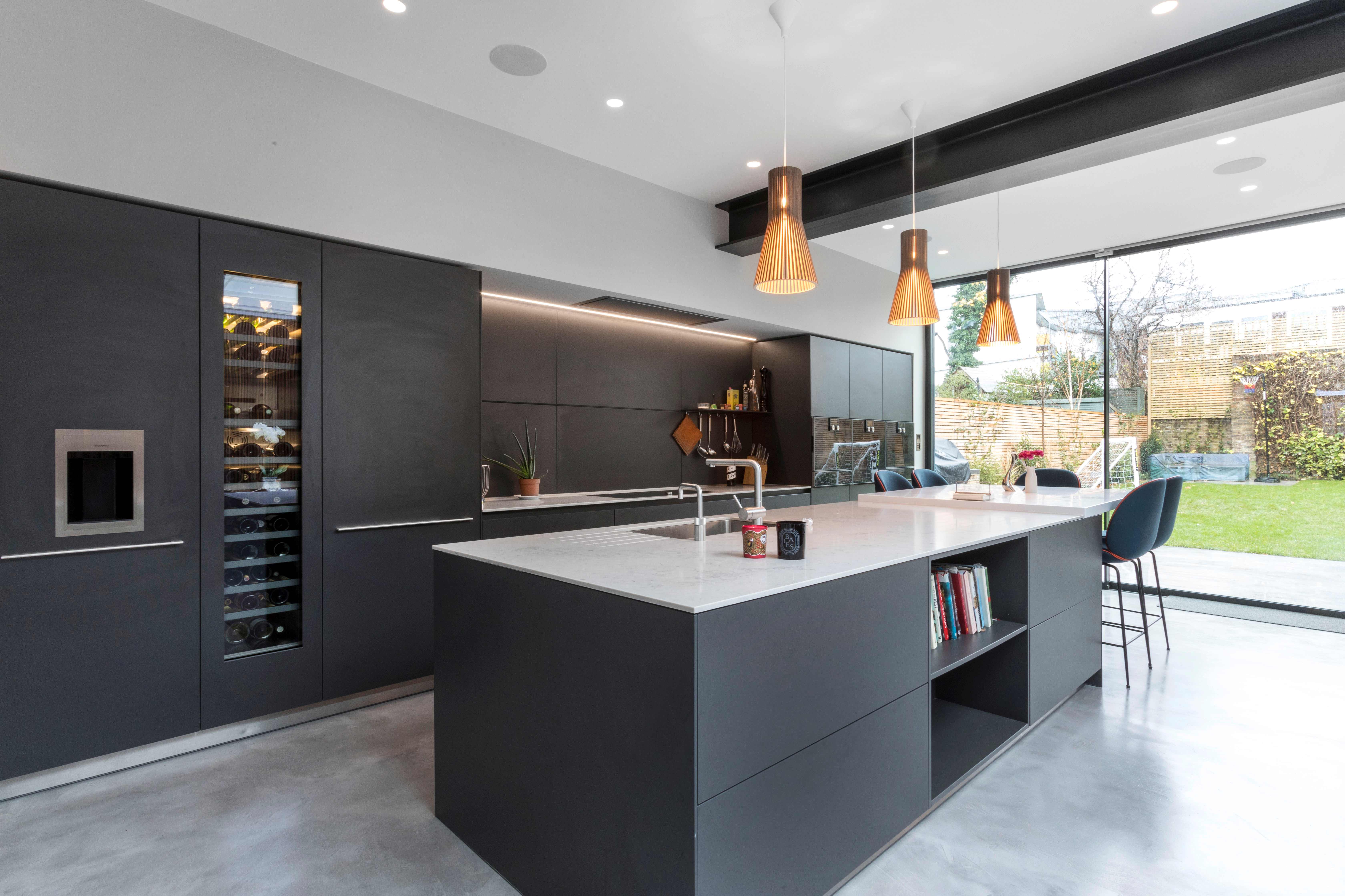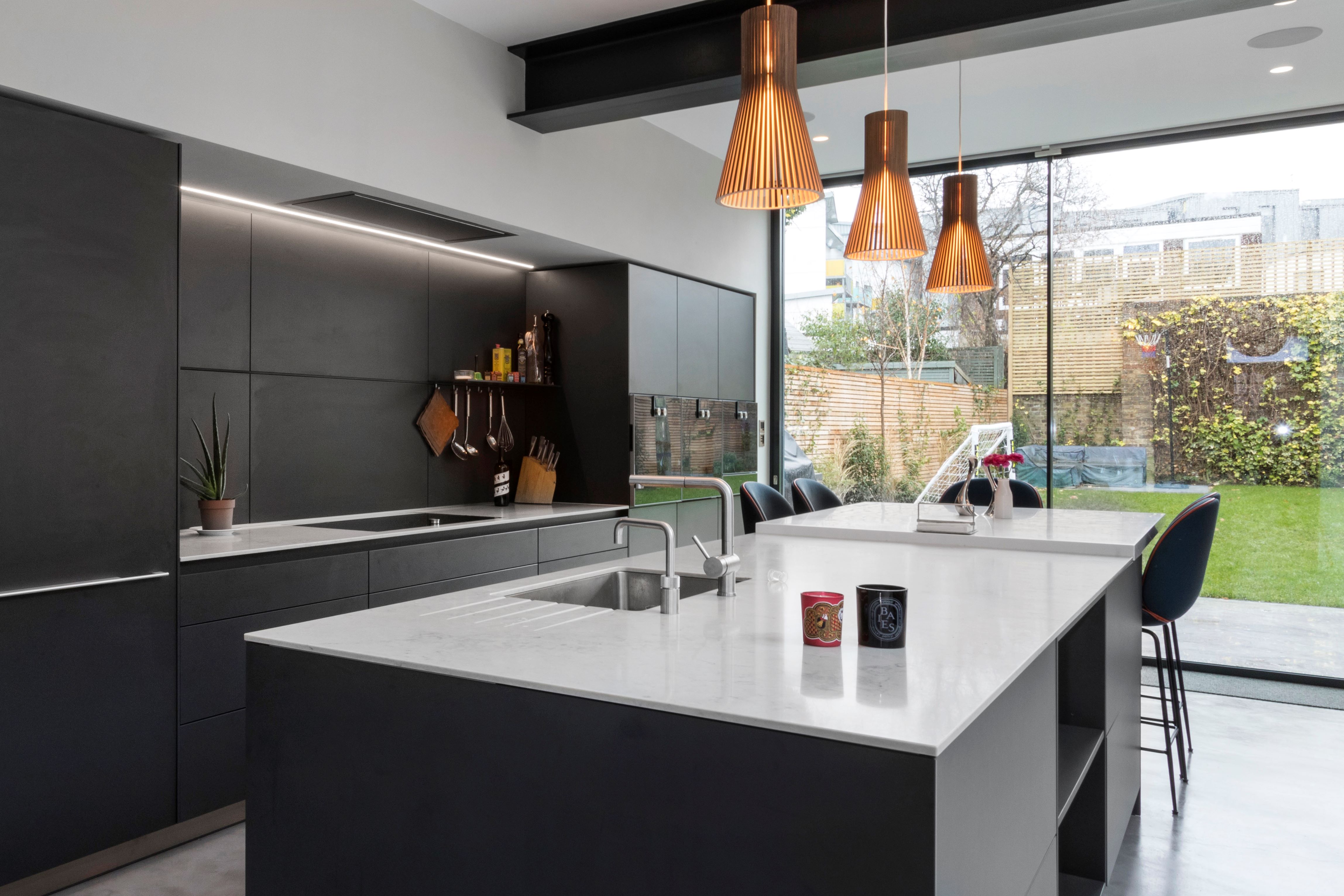 A sleek, matt black kitchen with a large central island and breakfast bar forms the functional centrepiece of the home, contrasting beautifully with softer timber and textured pendant lighting.