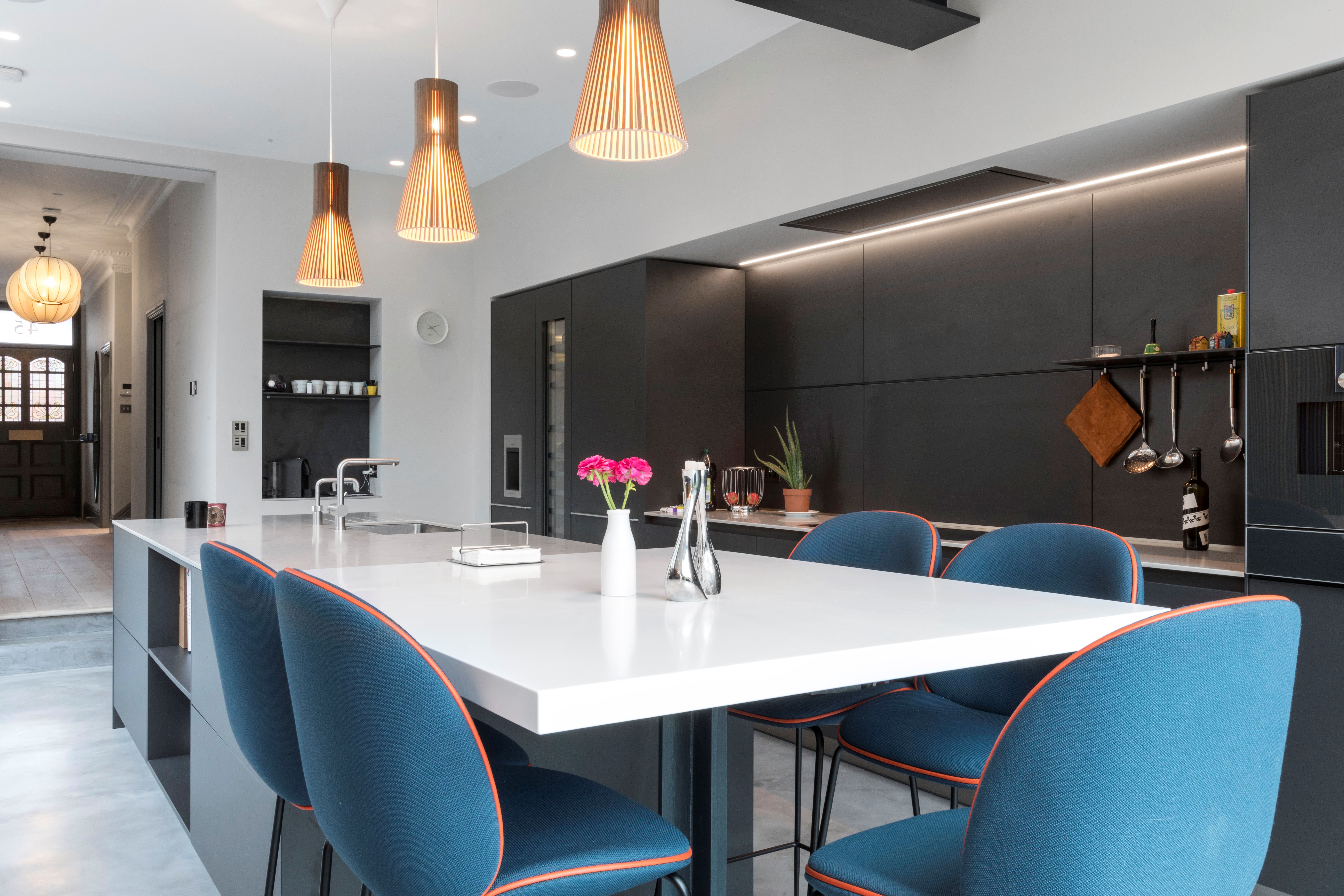 A bold, design-led family home renovation featuring a striking rear extension, bespoke joinery and layered interior spaces full of character and charm.