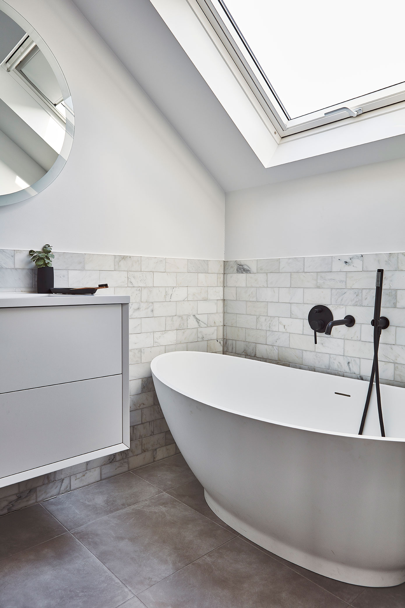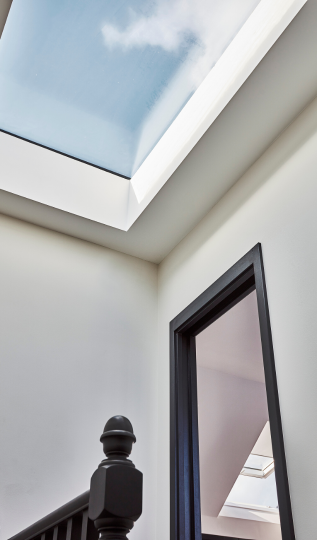The architectural design of the extensions, with large panes of steel framed glass at ground and loft level read as a modern addition but accentuate the beauty of the heritage property. Exposed brickwork and steel beams were installed alongside stunning bespoke joinery and help to create a contemporary feel alongside the original features. A monochrome colour palette was used throughout the house to integrate the spaces and create a feeling of consistency.