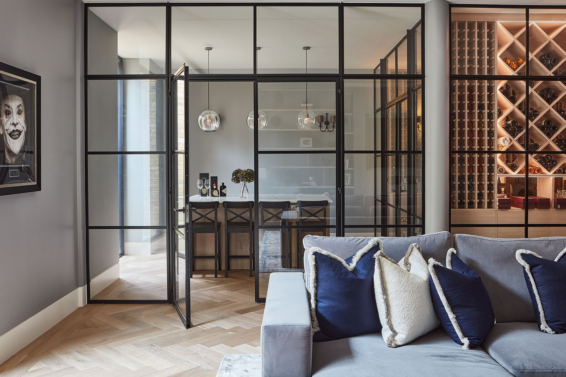 A large rear extension forms the heart of the home, designed to maximise natural light and garden views through expansive glazing and open-plan living. A calming palette of soft greys and deep blues runs throughout, with bespoke joinery and carefully layered textures adding warmth and interest.