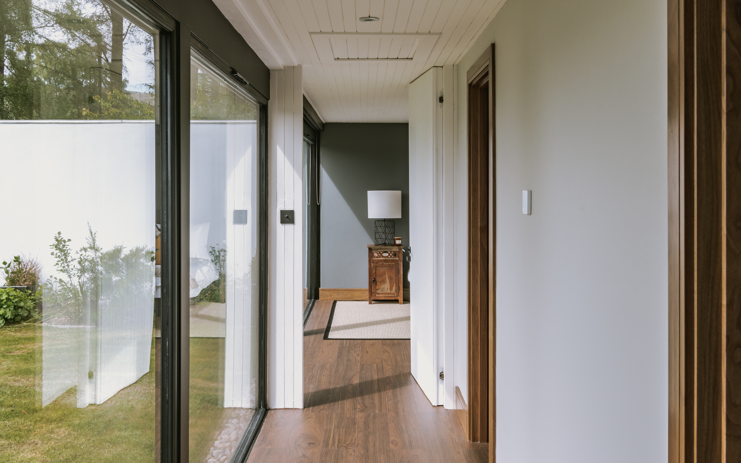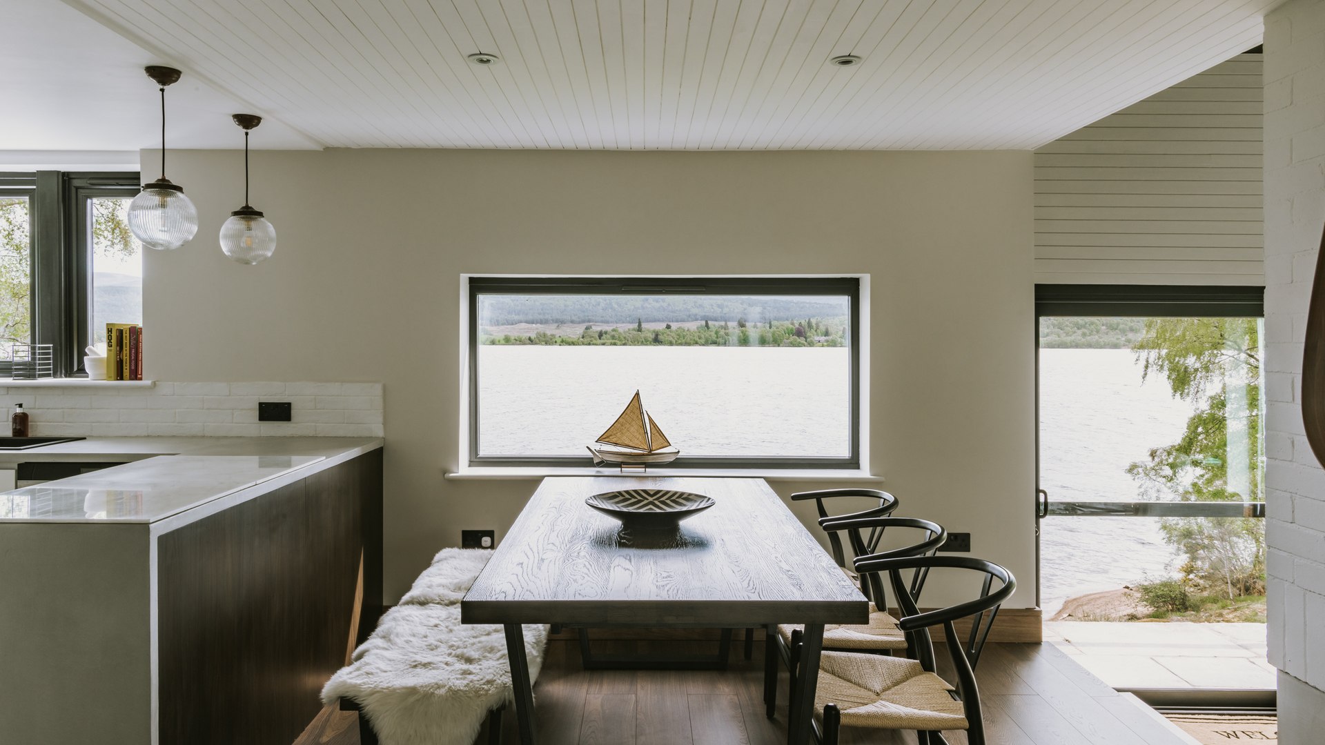 Working closely with the contours of the site, the redesign introduced large-format glazing throughout to capture uninterrupted vistas of the loch and surrounding woodland. The existing footprint was retained, but internal walls were opened up to create an expansive, open-plan kitchen and living area that serves as the heart of the home. A subtle, natural materials palette—featuring lime-washed walls, timber floors, and blackened steel details—anchors the home in its landscape while maintaining a calm, restorative atmosphere.