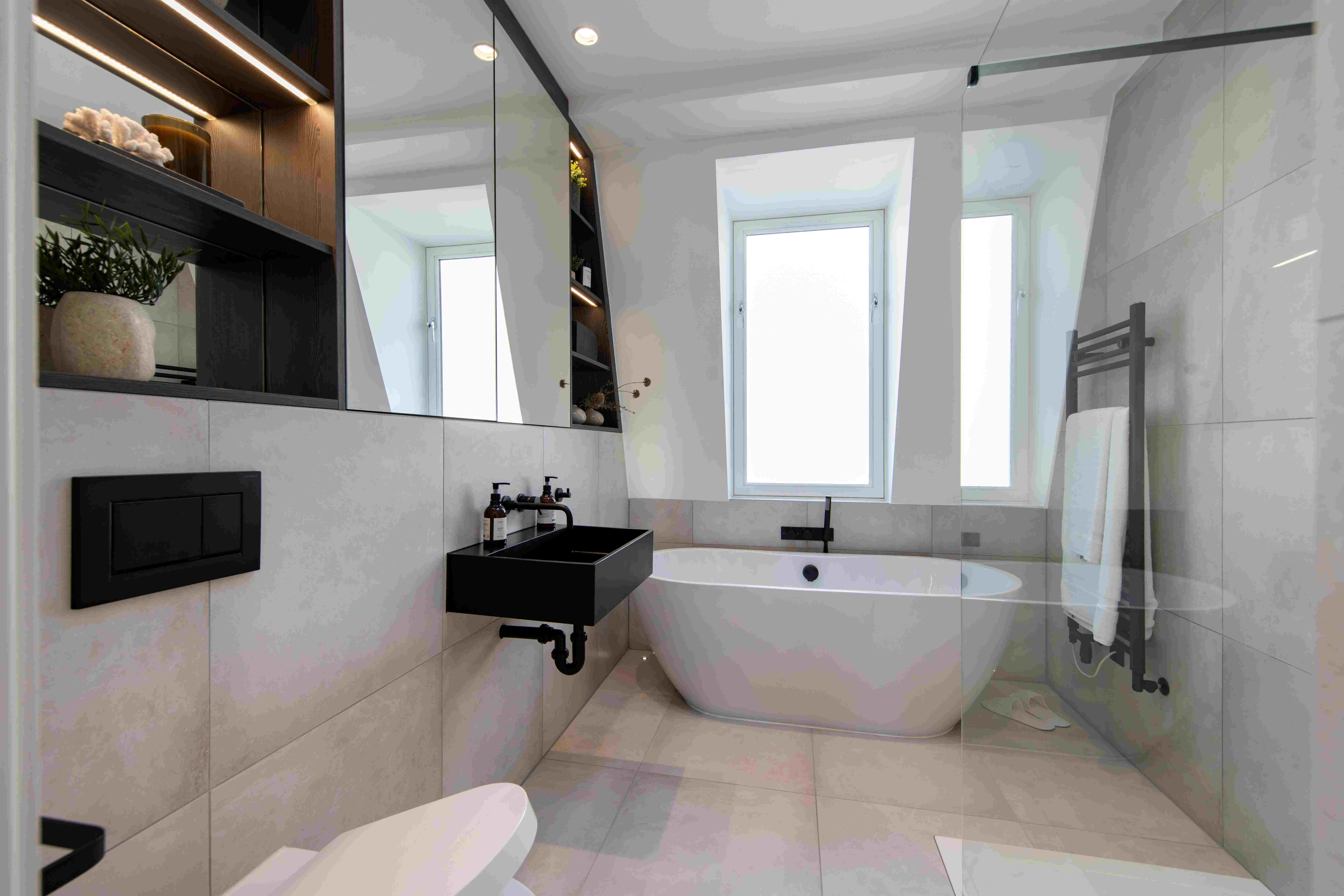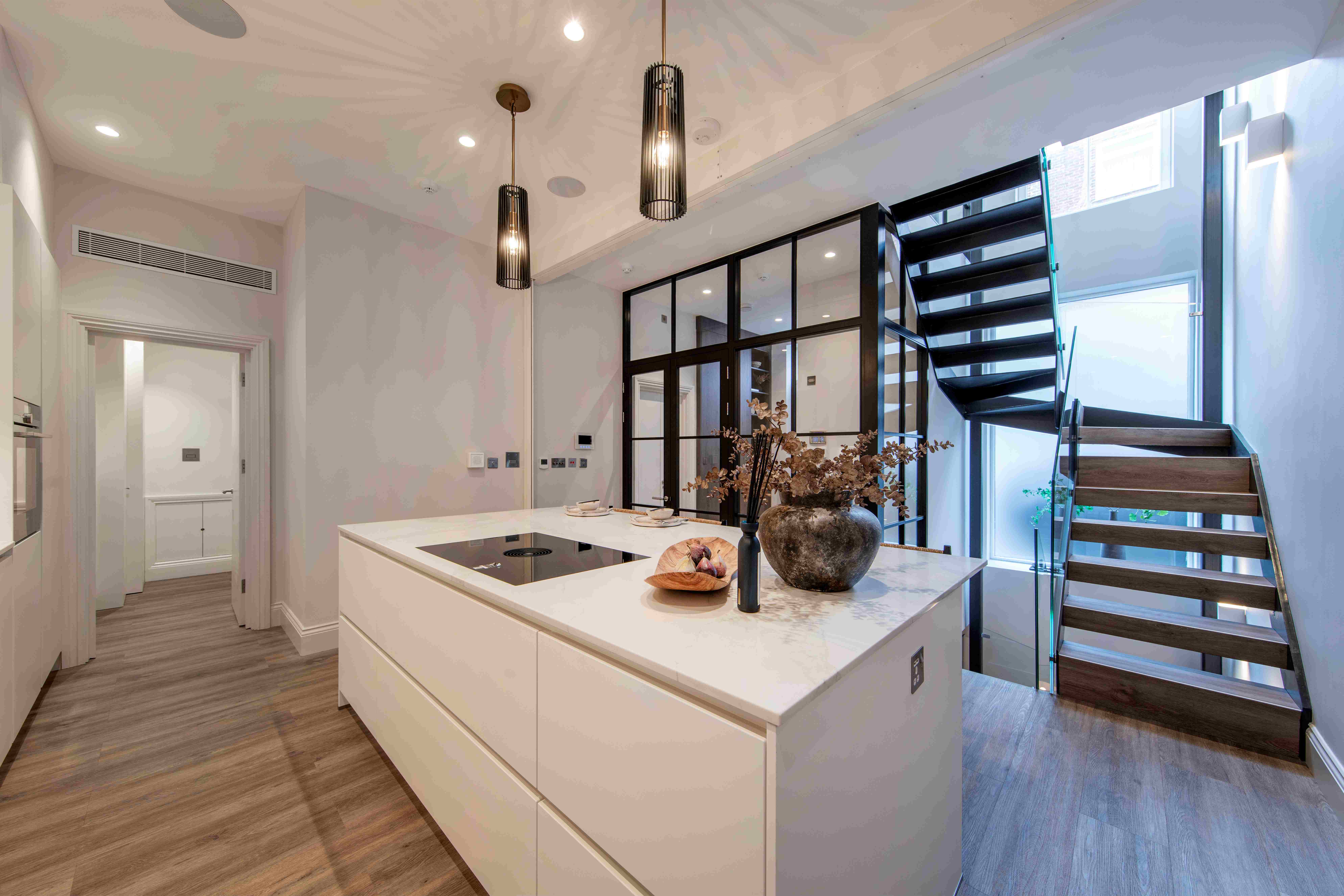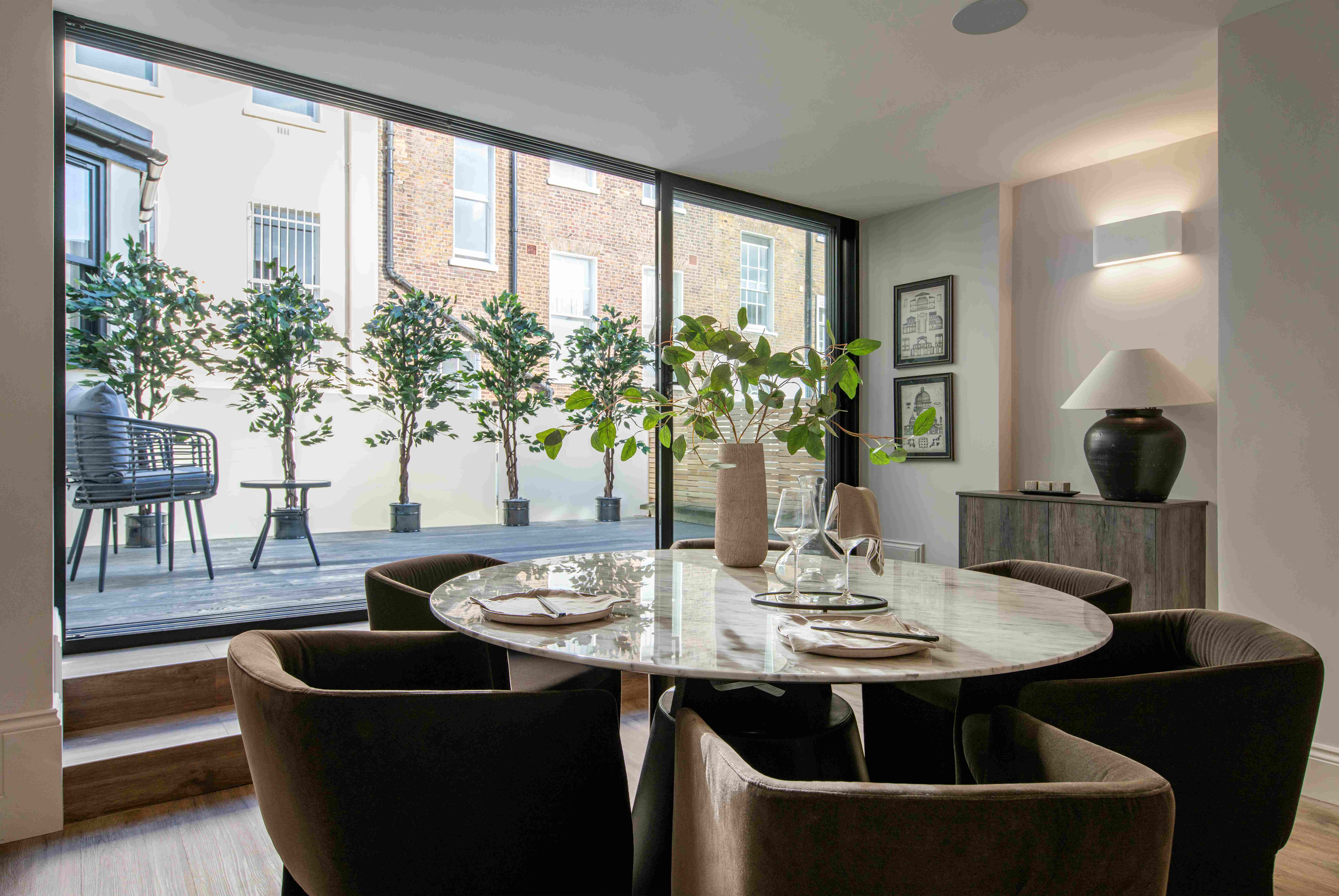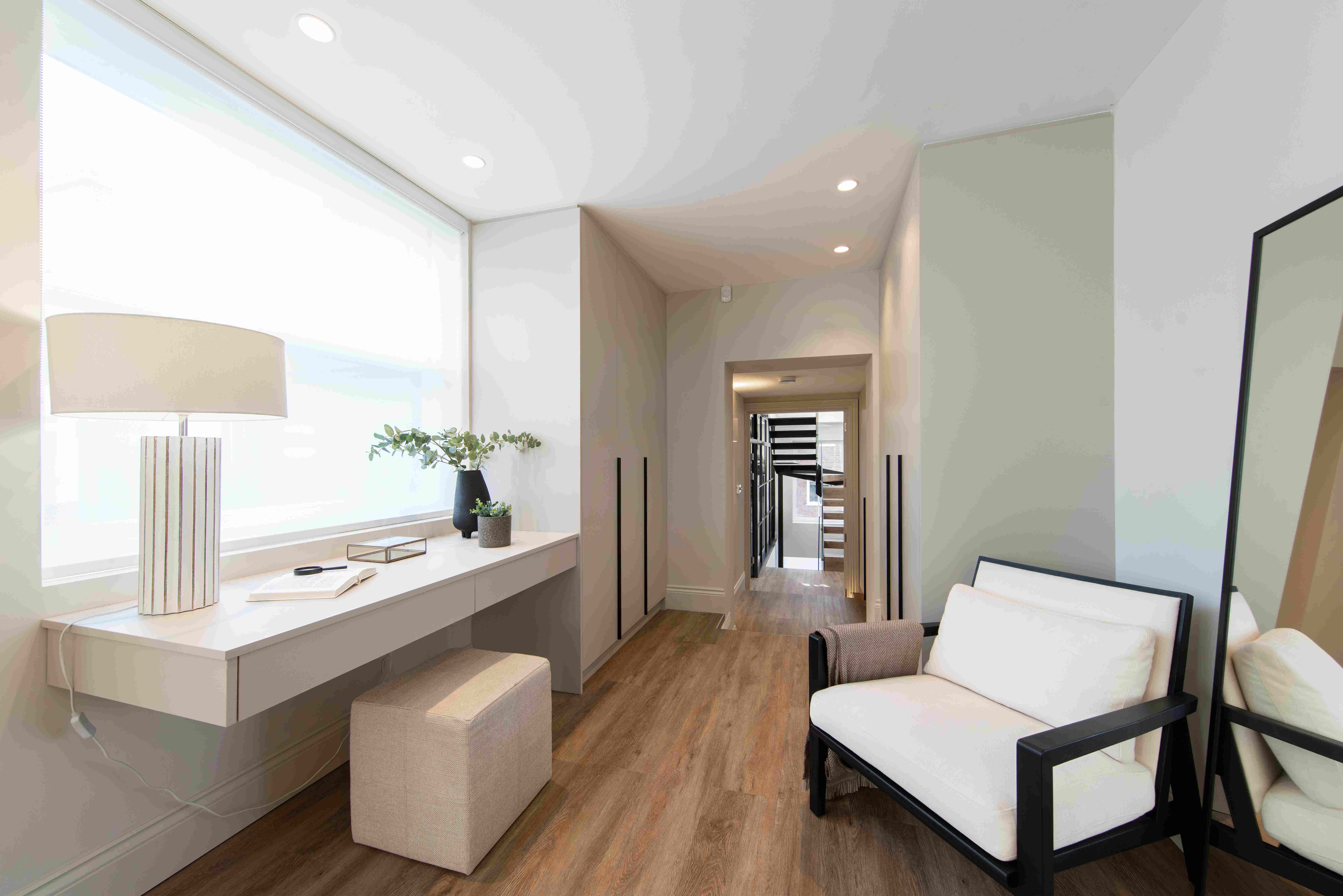 A calm, tonal palette of soft neutrals and natural finishes brings warmth and serenity. The upper-level living area is flooded with light from tall windows and opens directly onto a private terrace, extending the home’s footprint and creating a rare moment of outdoor calm in central London.