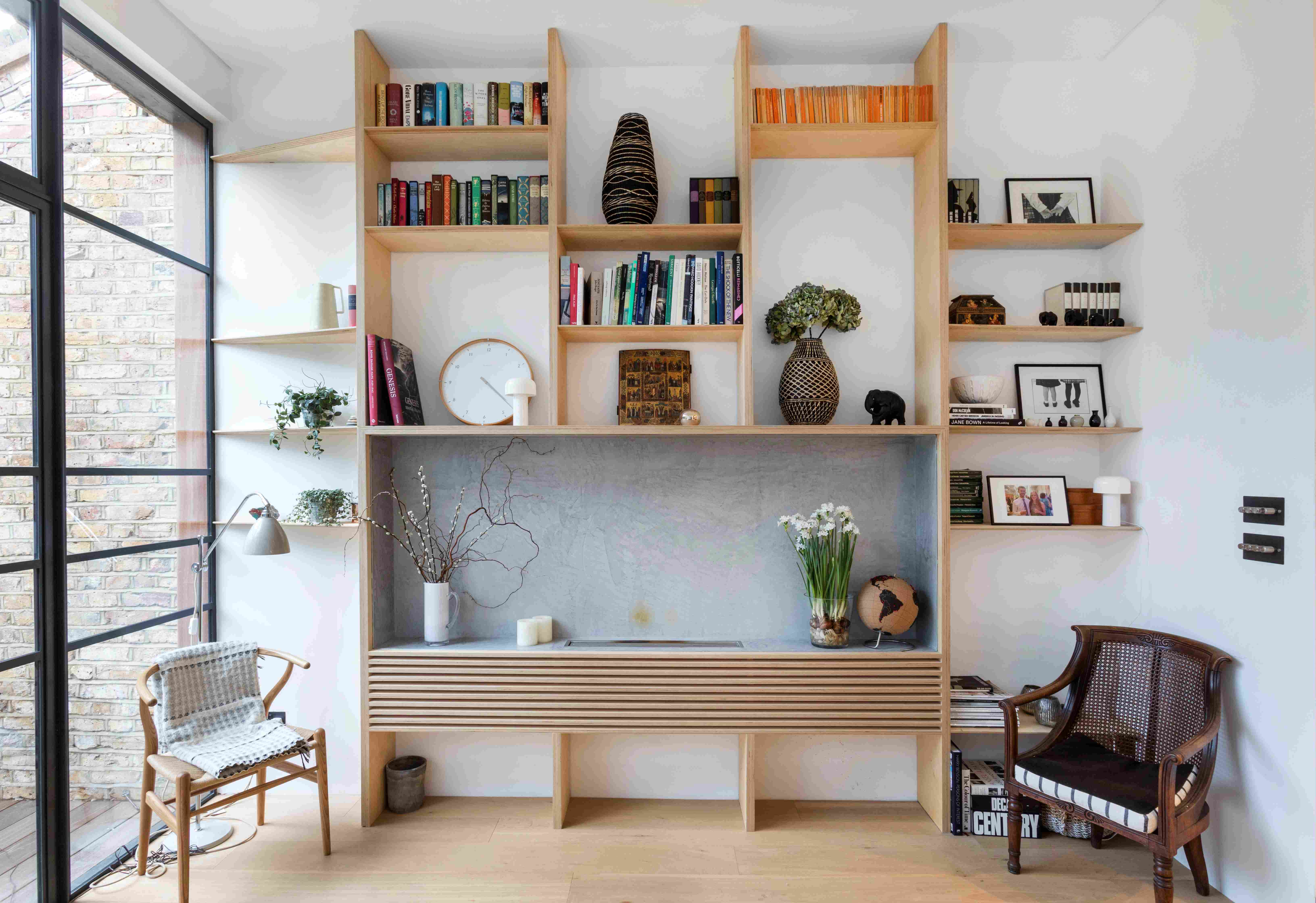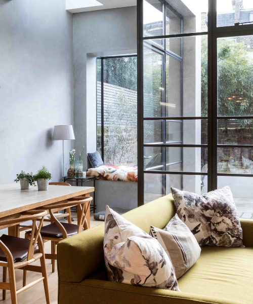 Beyond the kitchen, a calm rear living space opens onto the courtyard garden via oversized crittall-style doors. Custom joinery, pale timber flooring and smooth plaster walls create a minimal yet tactile aesthetic. A reading nook tucked beside the glazing provides a moment of quiet in the open-plan layout.